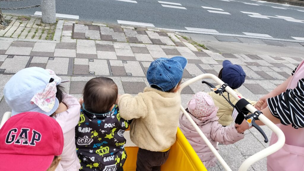 りす0くみは、歩きとカートで1号線までお散歩に行ってきました。