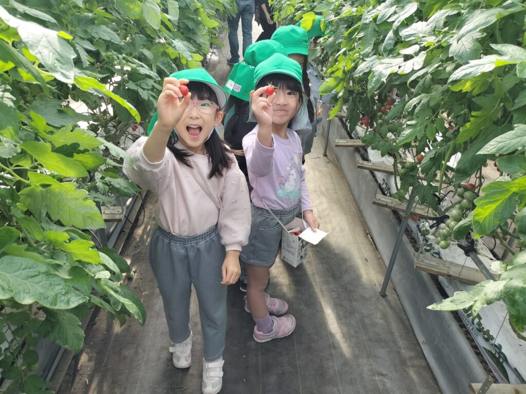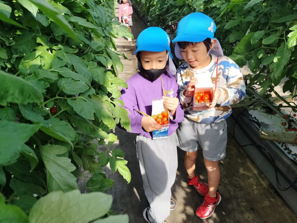 年長組みんなでトマト狩りに行ってきました。