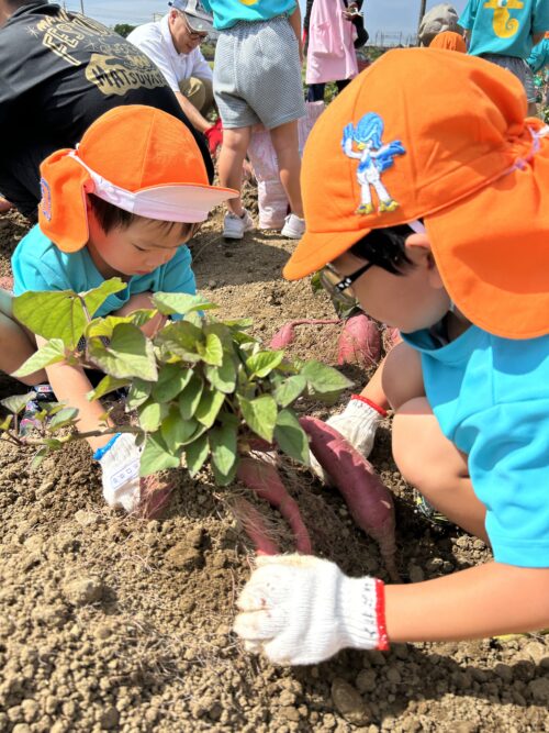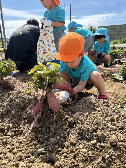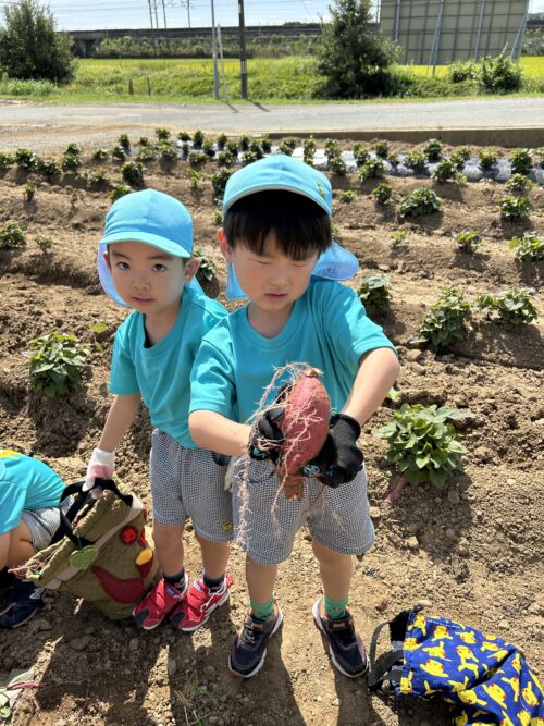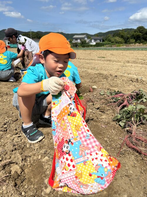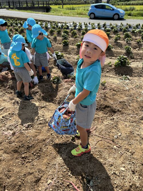 袋いっぱいに詰まったお芋袋を覗いて、こんなにたくさん採ったんだと満足そうににっこり😊何の料理にしもらおうか「お味噌汁」「焼き芋」「スイートポテト」とお友だちと相談し合っている会話もありました。どんな料理になるのかな⁉