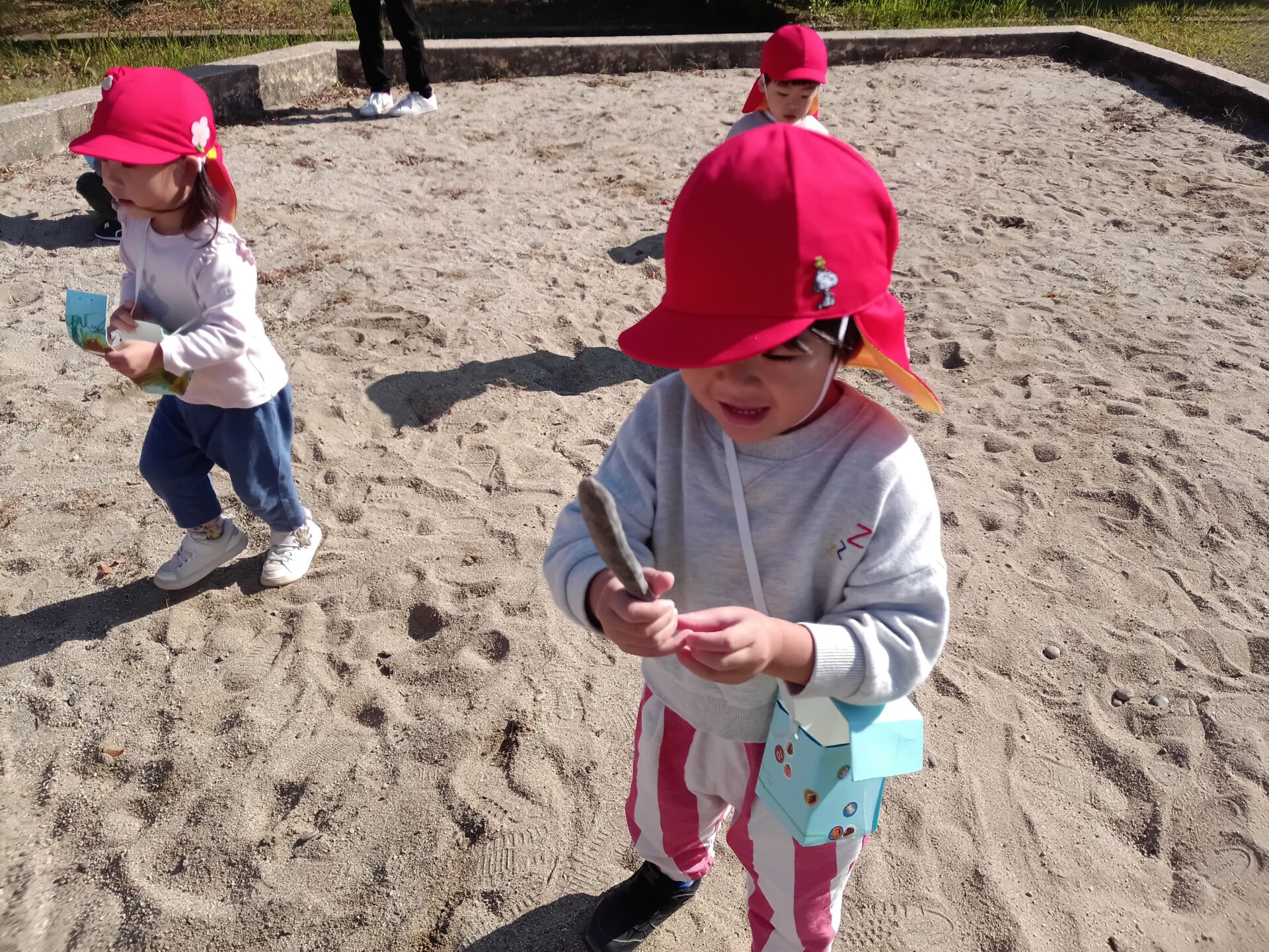 秋の遠足として、うさぎ組は公園に歩いていきました。 お友達と手を繋いで、道路を渡る時にはしっかり手を挙げて! 公園に到着。今日は秋の宝物を見つけます♪ 「見て!...